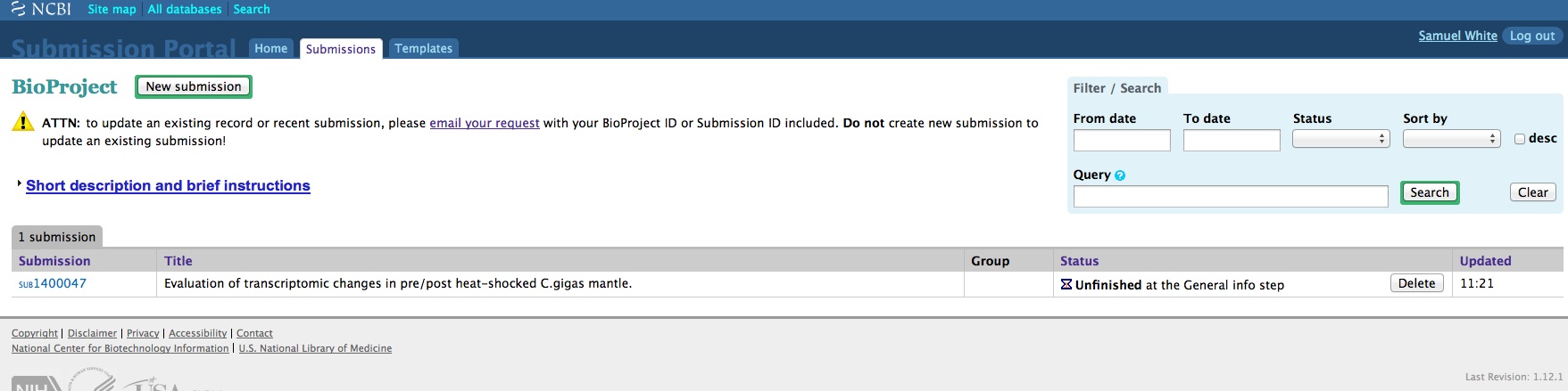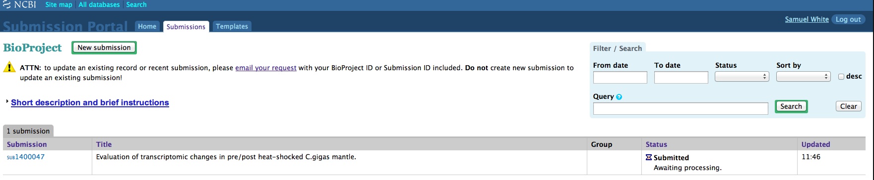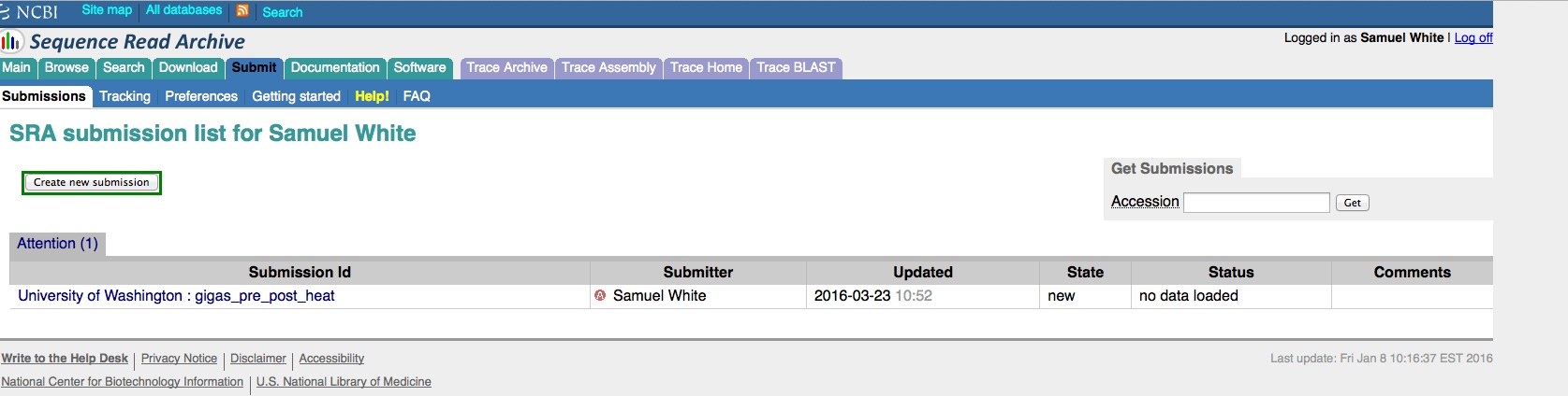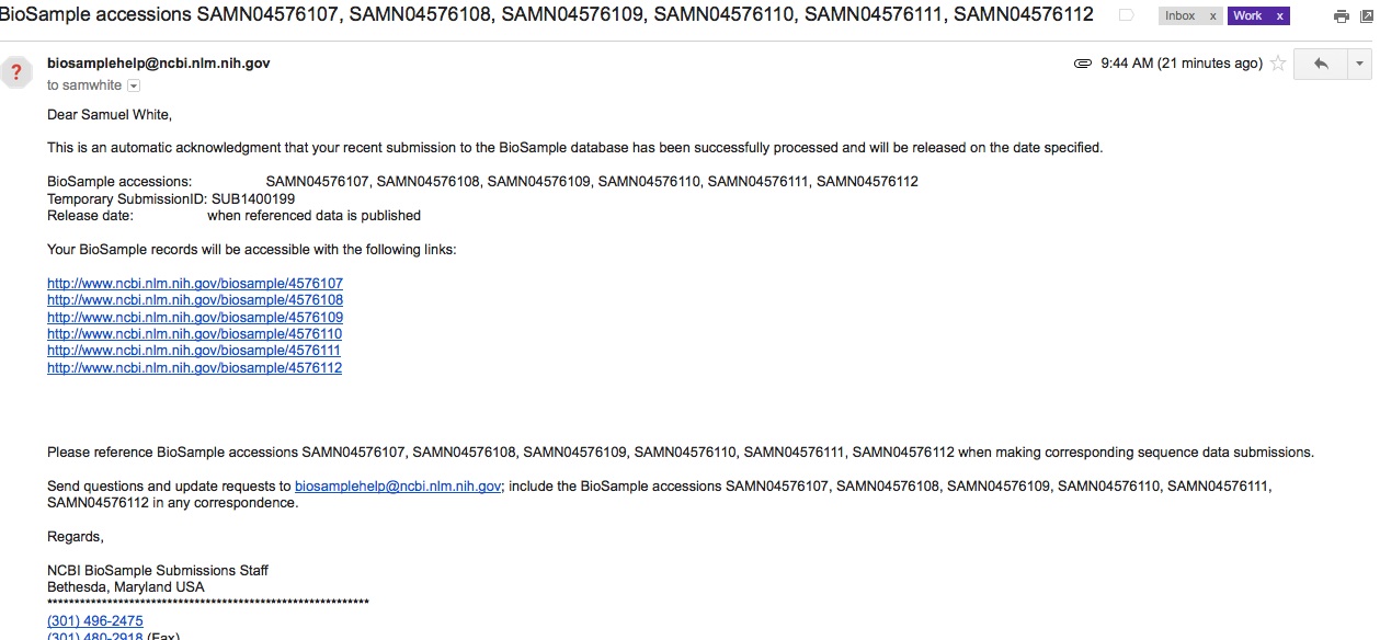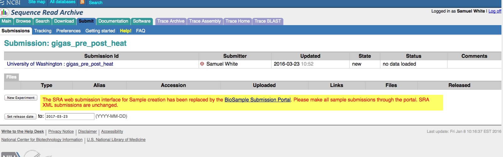 Once any of the three required components for SRA submission have been created (SRA, BioProject, and BioSamples), they can no longer be edited/deleted by the user! Understandable if they’ve already been publicly released, but if they’re still in pre-public release status, I think the user should be able to make changes as they see fit. As it currently stands, the user has to email the help desk at SRA and/or BioProjects to make any changes.