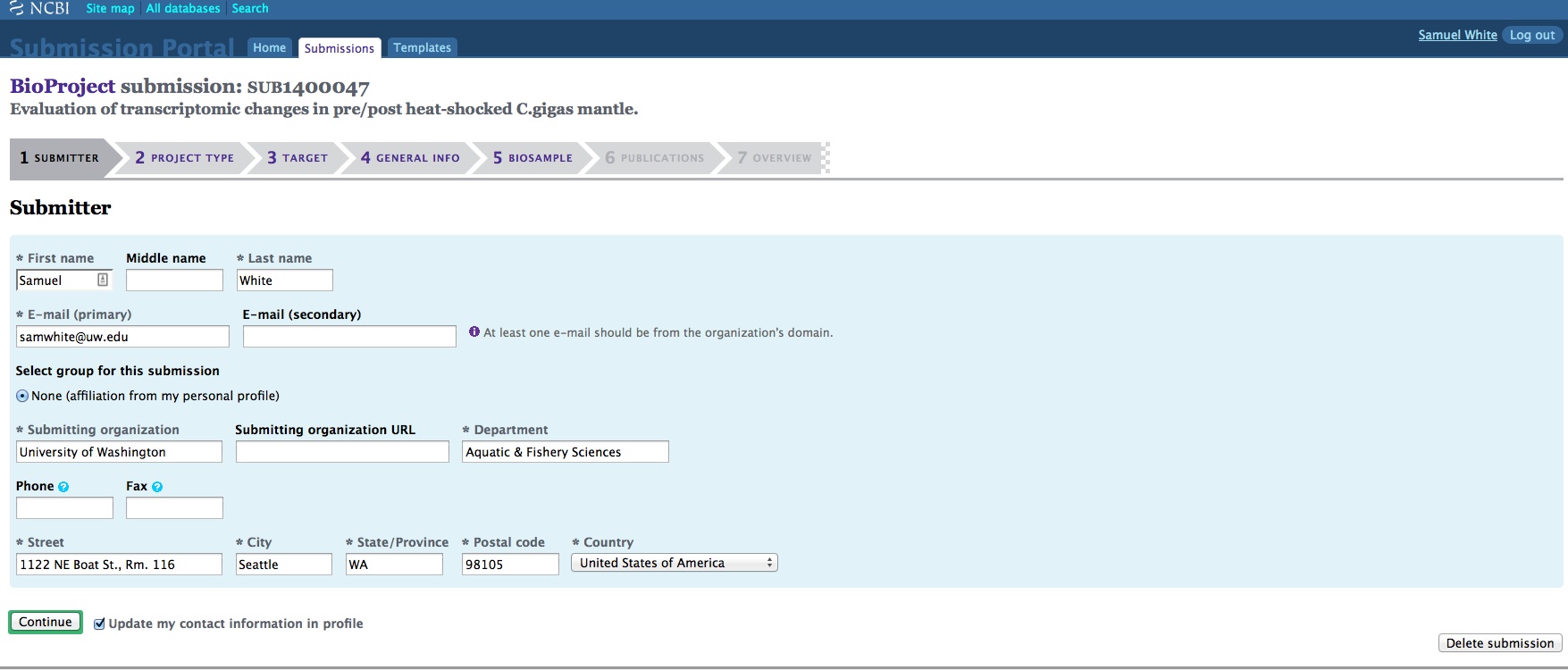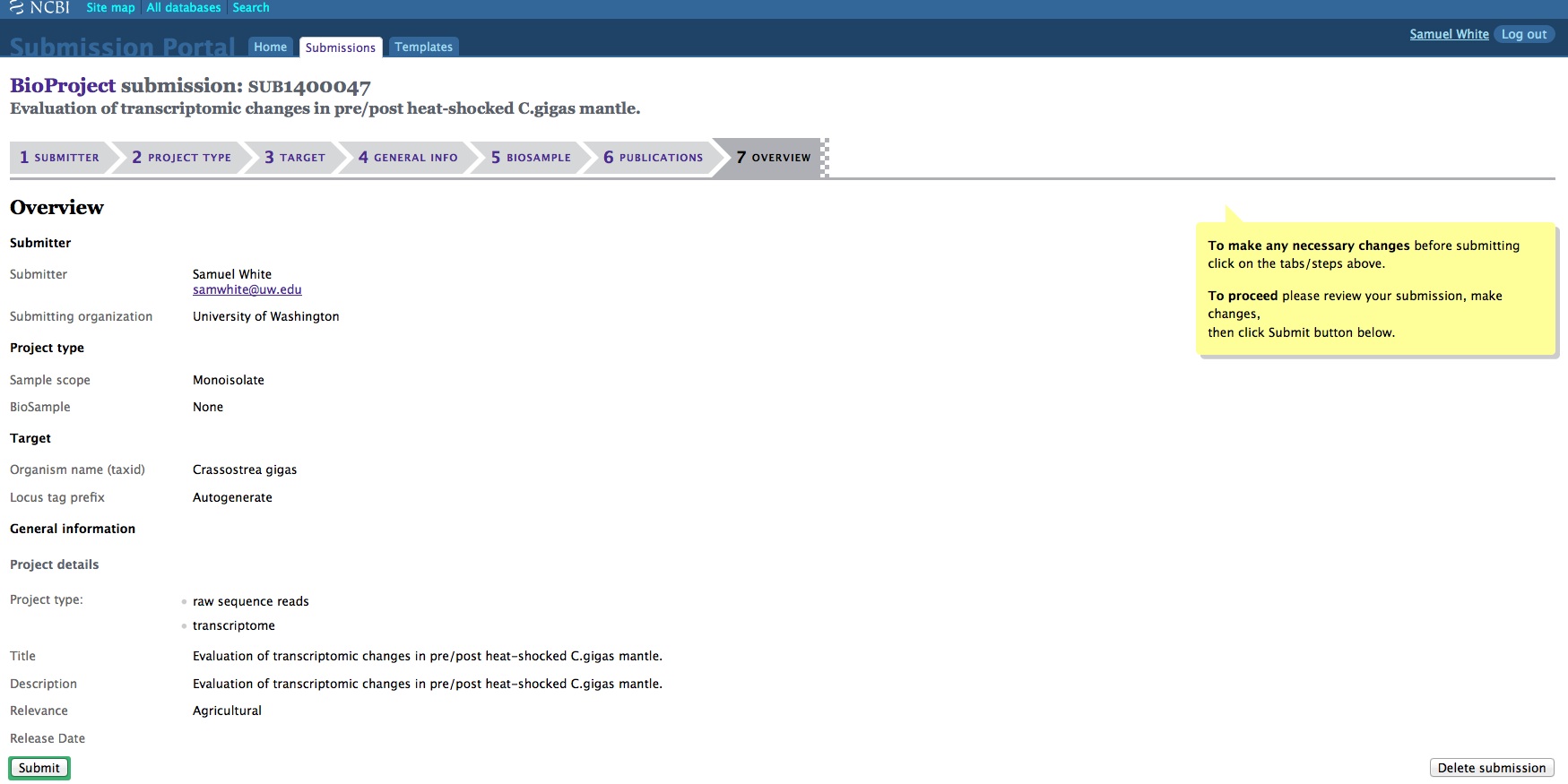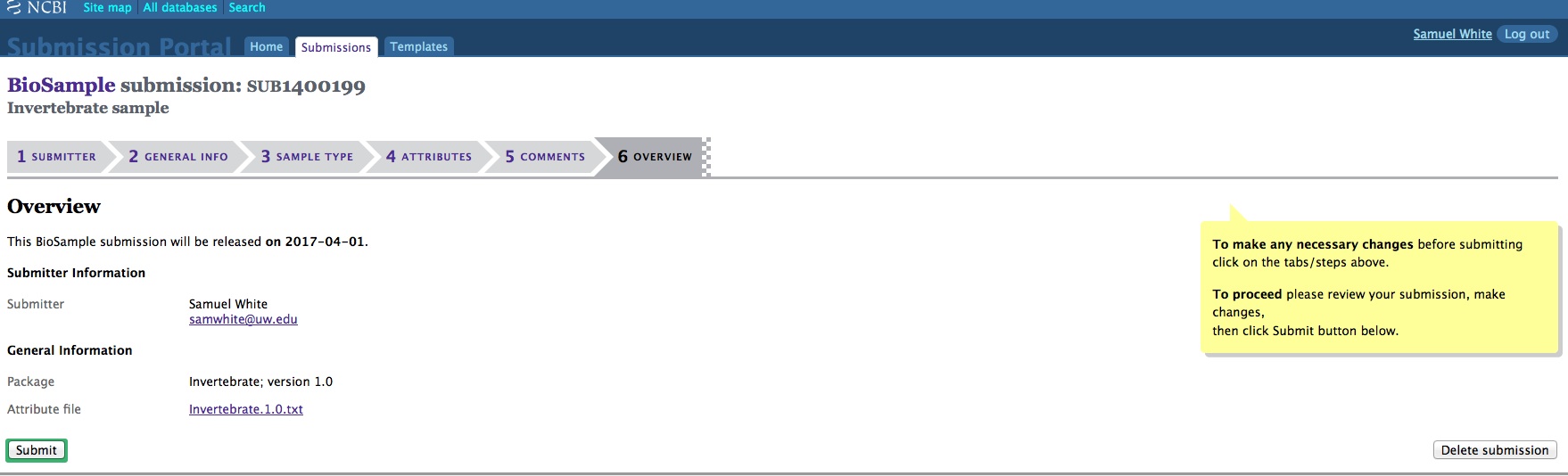 Once any of the three required components for SRA submission have been created (SRA, BioProject, and BioSamples), they can no longer be edited/deleted by the user! Understandable if they’ve already been publicly released, but if they’re still in pre-public release status, I think the user should be able to make changes as they see fit. As it currently stands, the user has to email the help desk at SRA and/or BioProjects to make any changes.