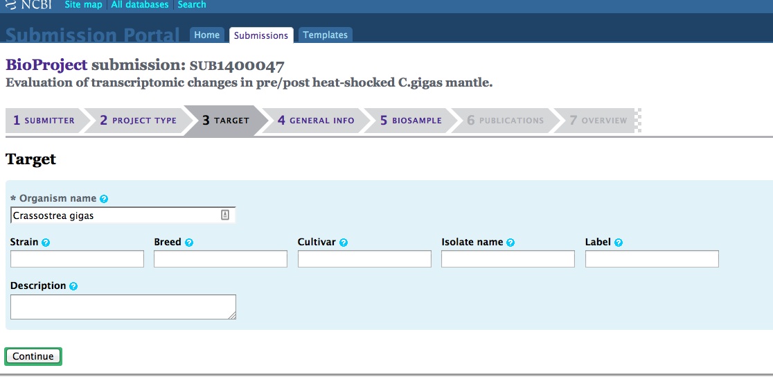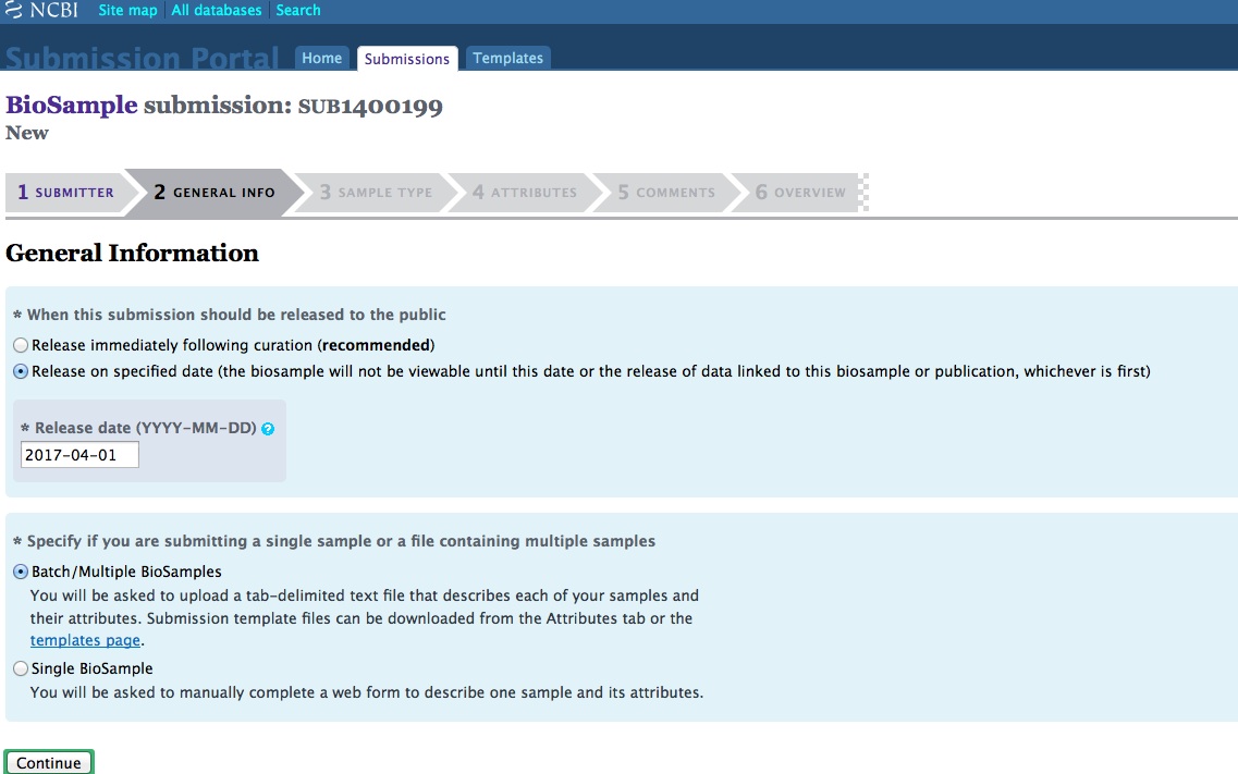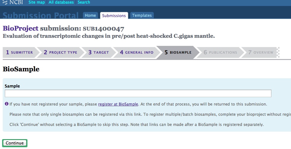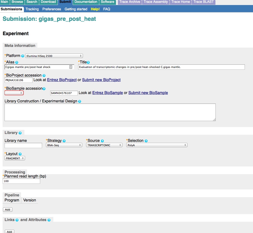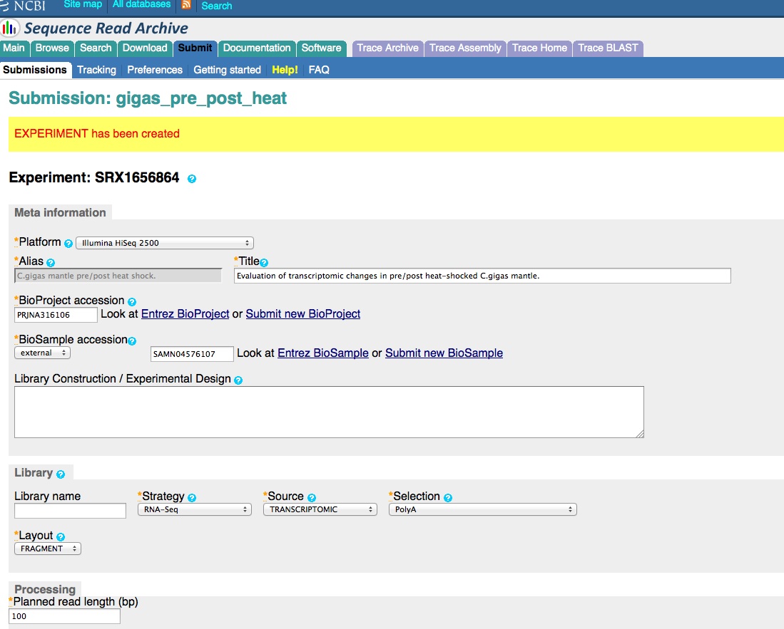 Create BioSample(s). This will be the next level of the hierarchy in the SRA submission and will be displayed as SAMPLE. This only shows up in the SRA when you create a new “Experiment”