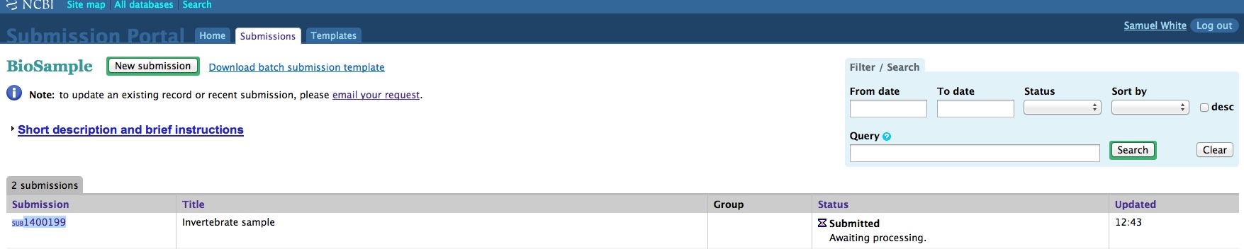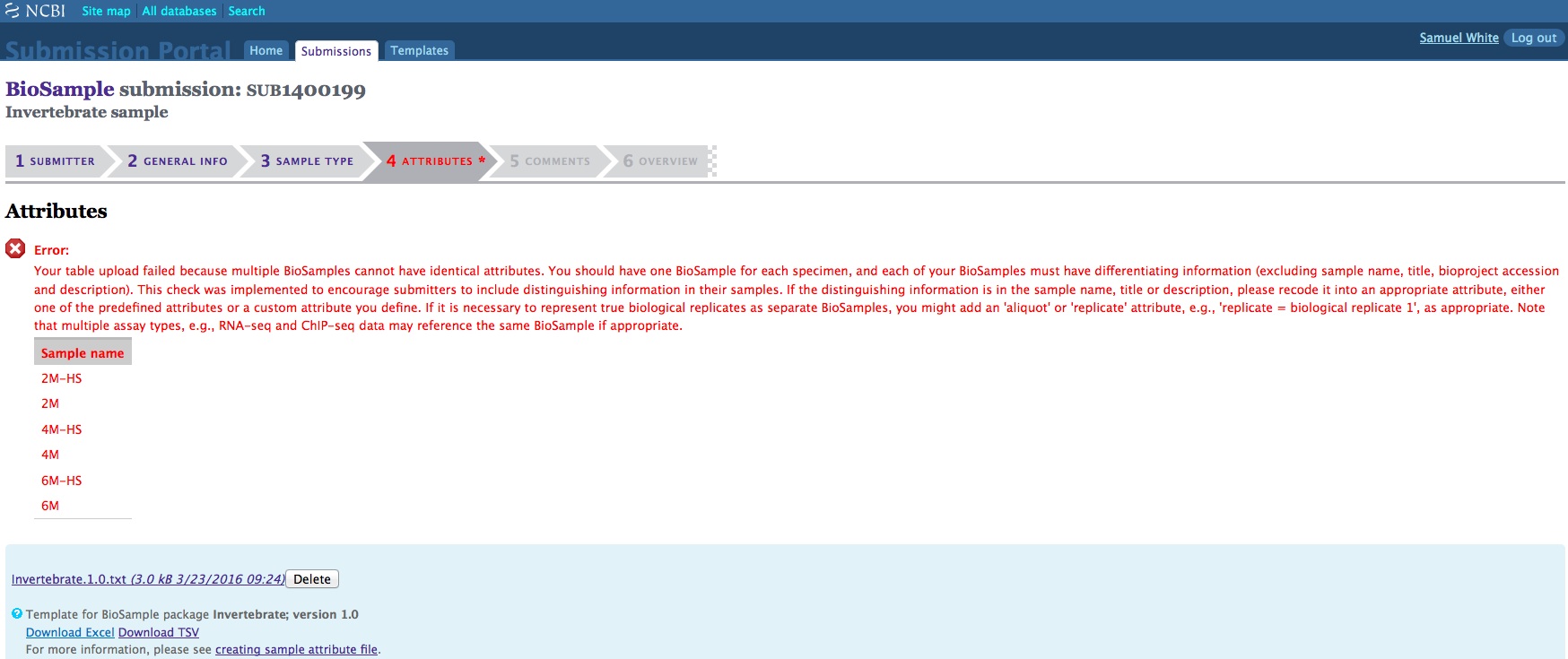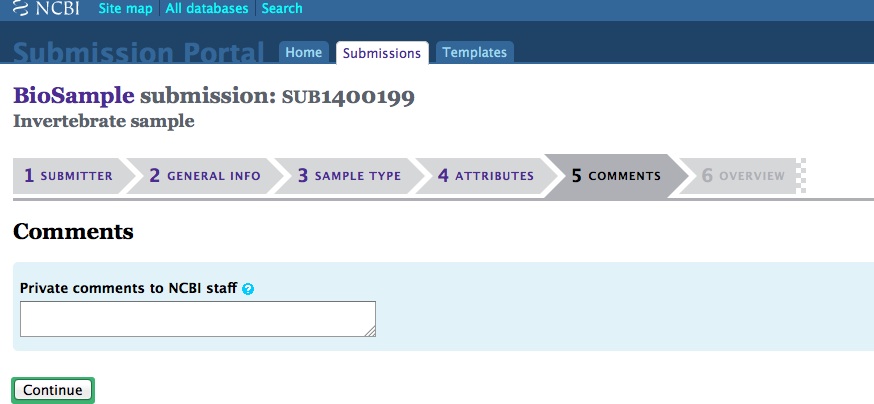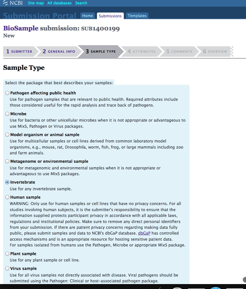 When creating a batch submission for BioSamples, there’s no way to set a Title attribute. This means all of your submissions (in my case) will have all have a title of “Invertebrate sample”. Considering that I will likely end up with dozens of BioSamples, that means there’s no easy way to distinguish them from each other without some extra clicking and poking around.