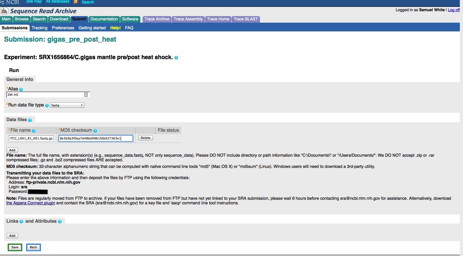 Create a Run. This option is available once you’ve saved your experiment. This is where you provide your sequencing filename and associated MD5 checksum. This will also provide you with the login info to upload your sequencing files via FTP to NCBI servers. You can associate multiple sequencing files within a single run. This should be done if your sequencing files all provide data for the BioSample you selected. However, if you have sequencing files that are associated with different BioSamples, then you need to create an individual Experiment (and Run) for each BioSample!