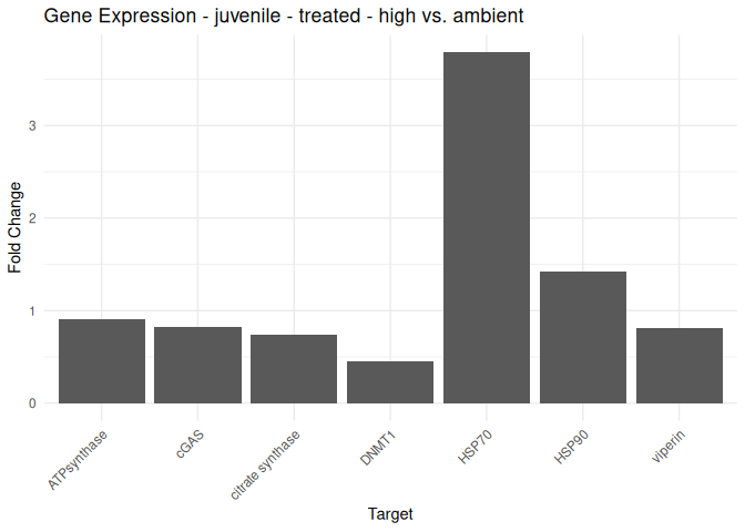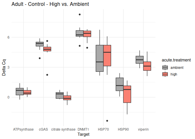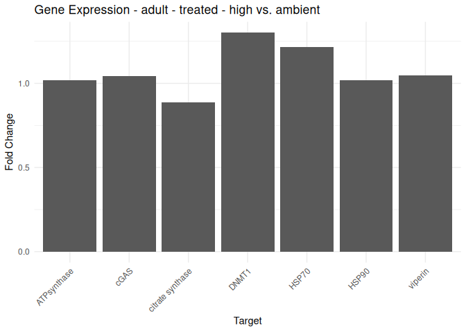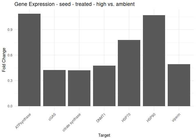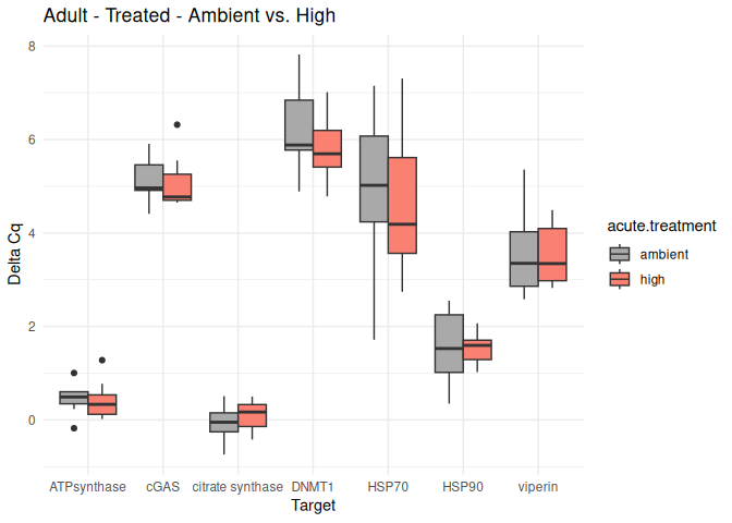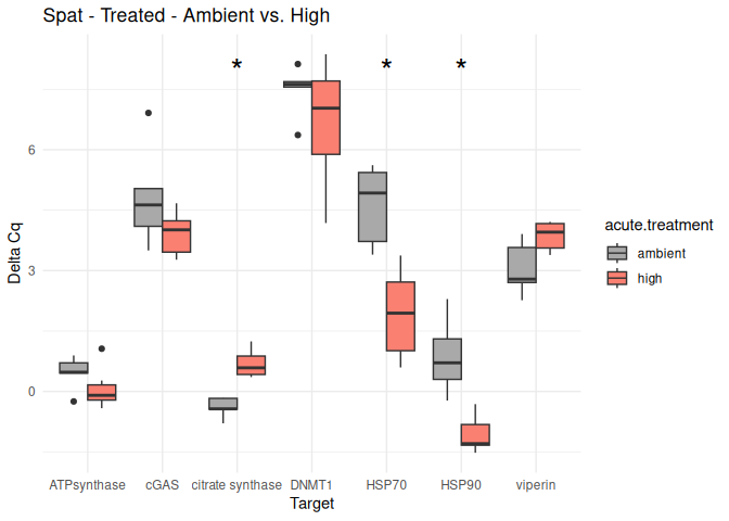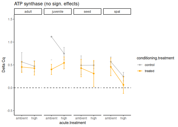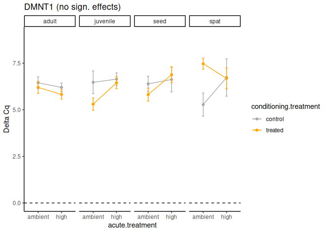 - Effects of acute treatment and life stage are just barely not significant for ATPsynthase and DMNT1. It is particularly interesting to see the trend for higher DMNT1 expression in spat at ambient temperature. There is also a trend for lower expression of ATPsynthase in seed at high temperature, but not technically significant.