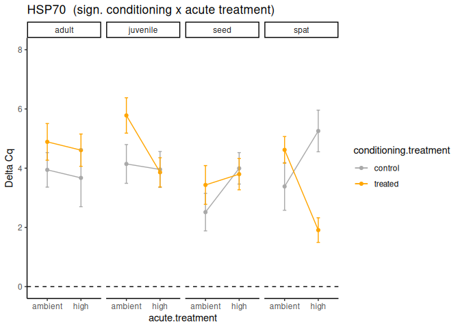 - HSP70 has significantly lower expression in treated spat than control spat at elevated temperature. No other lifestages have significant differences between conditioning treatments at high temperature.