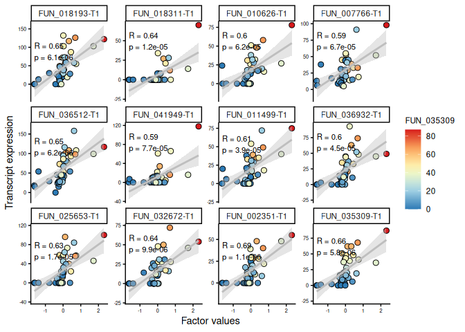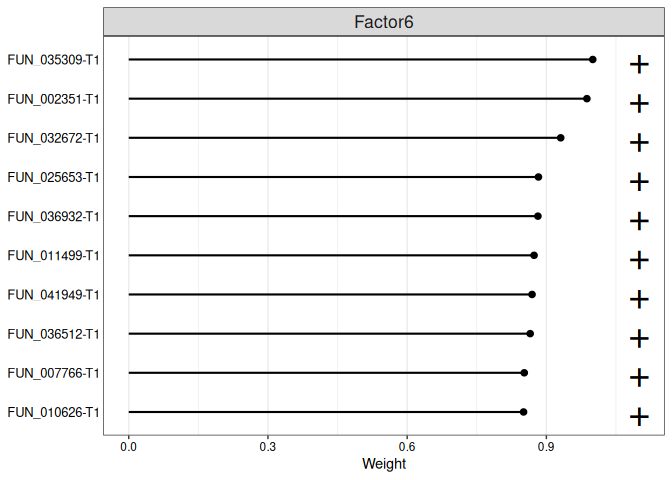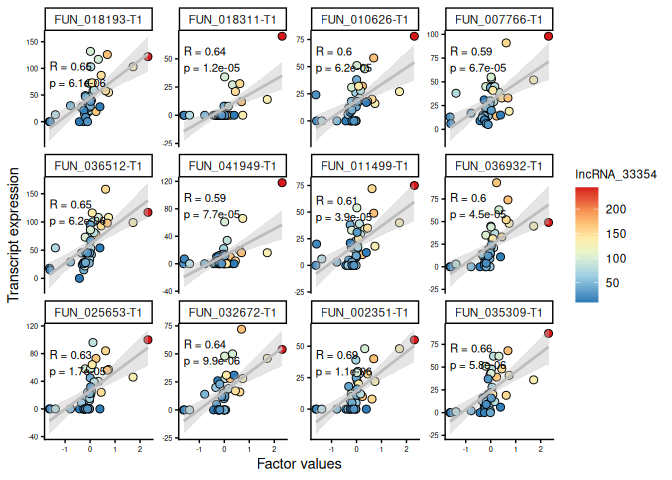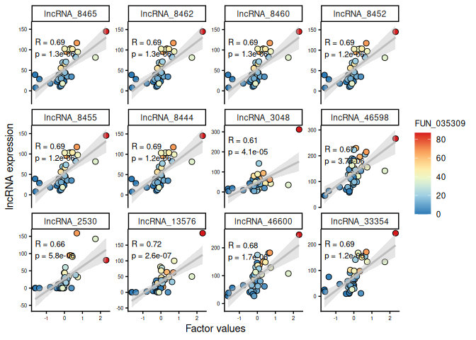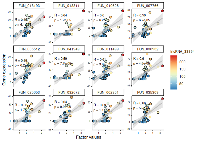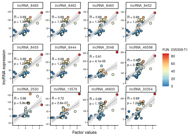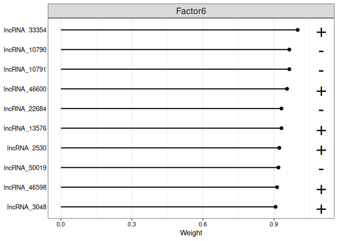 top_lncRNA cat("Top lncRNA by absolute weight for factor 6:", top_lncRNA, "\n")
