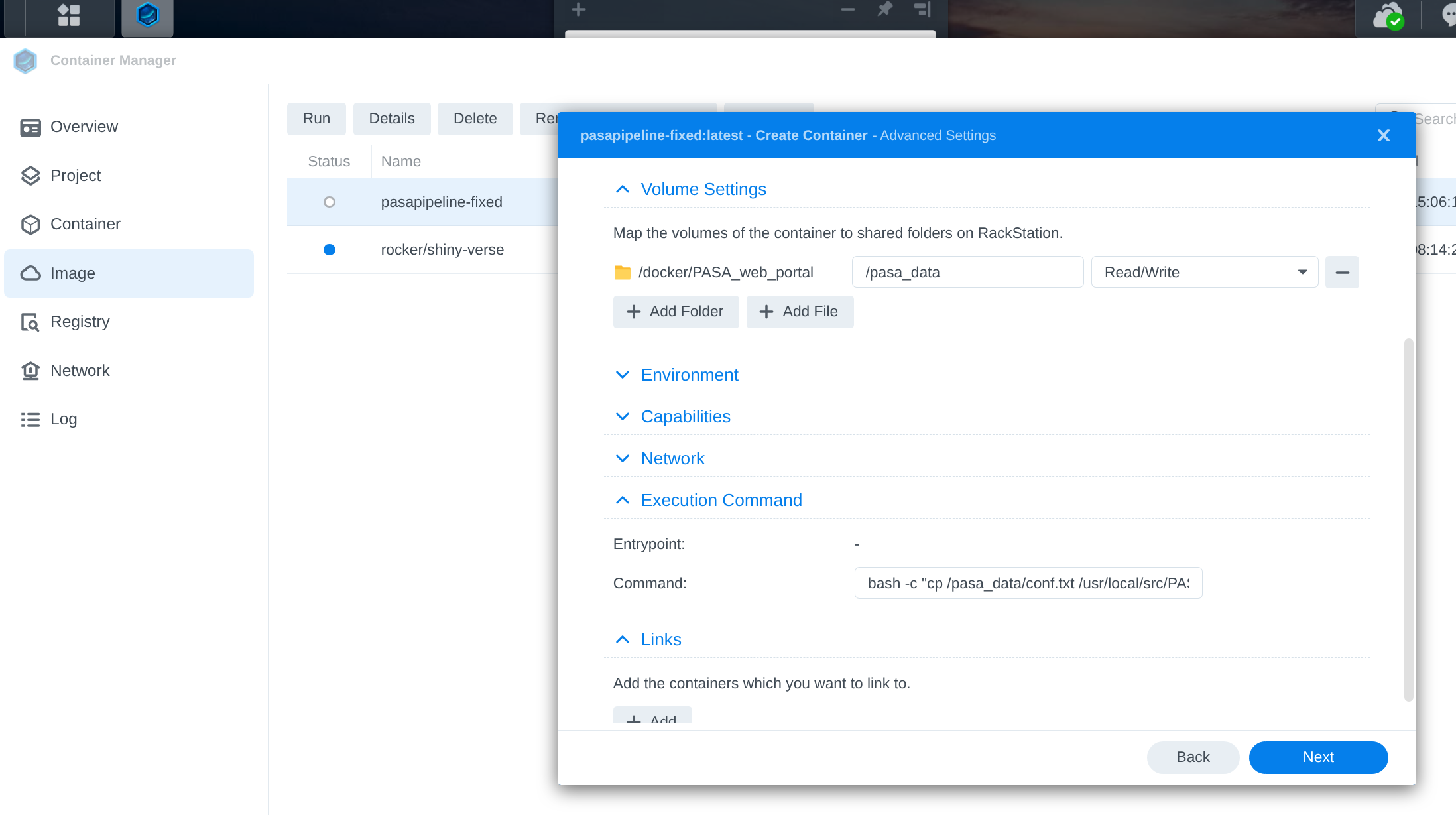 This opens the container creation wizard where you configure: - Container name - Port mappings - Volume mounts - Environment variables - xecution Command: bash -c "cp /pasa_data/conf.txt /usr/local/src/PASApipeline/pasa_conf/conf.txt && /usr/local/src/PASApipeline/run_PasaWeb.pl 9000" - Port Settings: